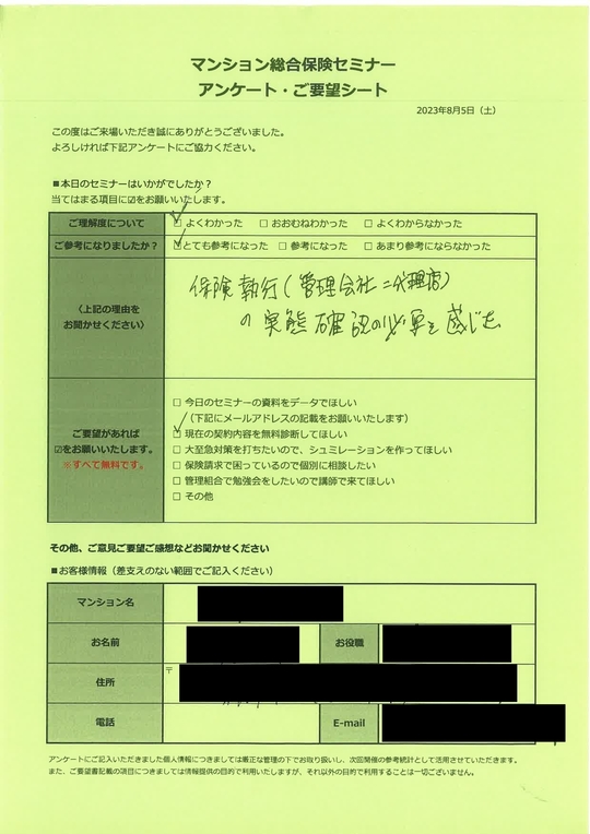 現場ではよくお話しする内容ですが『ここまでマンション保険の話をきちんと聞いたことがない・・・。』というお声をいただきました。これは実は現場でもよく言われるお言葉です。それだけ担当している代理店(管理会社系代理店も含む)がいかに現場で大切なことを伝えていないかがよく分かります。