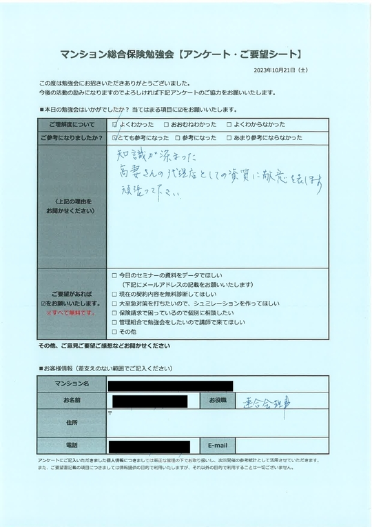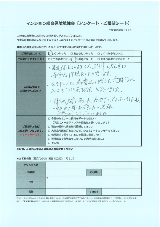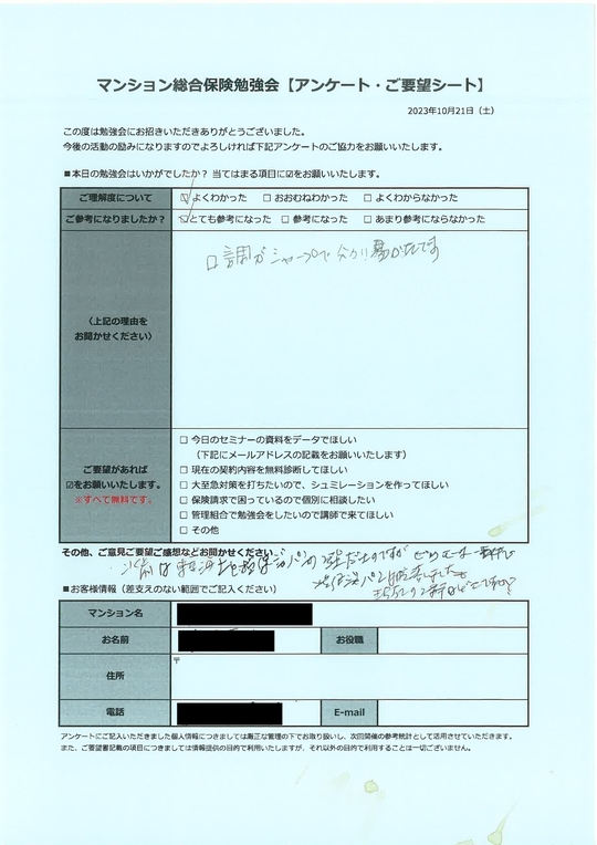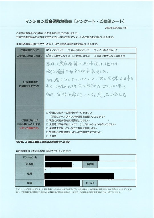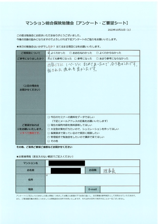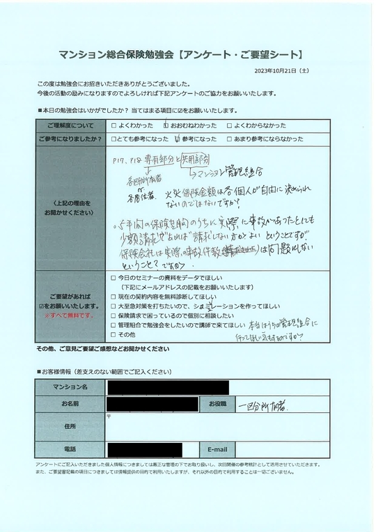 とにかく、今のマンション保険の仕組みを知っていただきたいという想いでお話しさせていただきました。