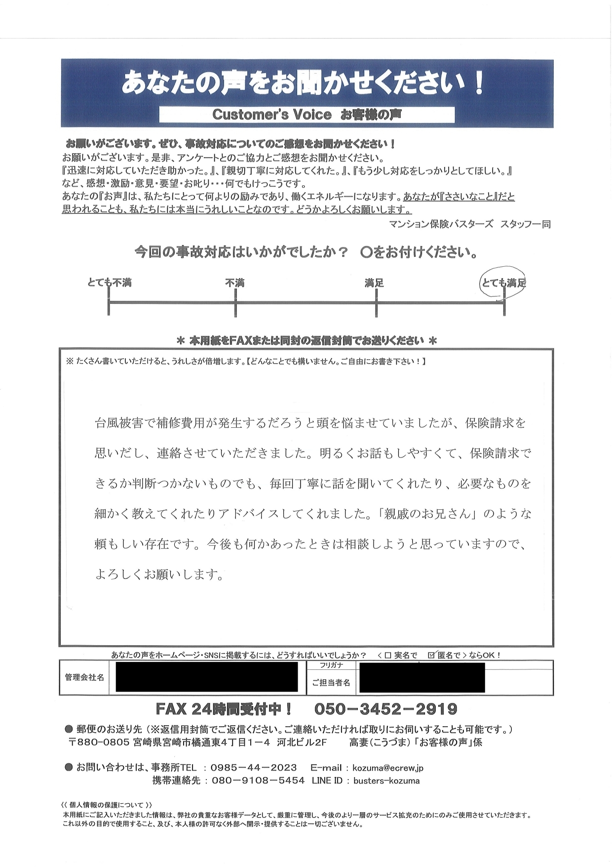 Y様、ありがとうございます。こちらこそ事故対応の際はいつも助かっています。お互い管理組合のために!という目線でいるからこそ細かい話などできるのだと思います。事故対応の際はこちらとしても管理会社フロントの方の協力や連携は不可欠なので今後も連携を取りながら管理組合様のためにやっていきましょう。今後ともよろしくお願いいたします。