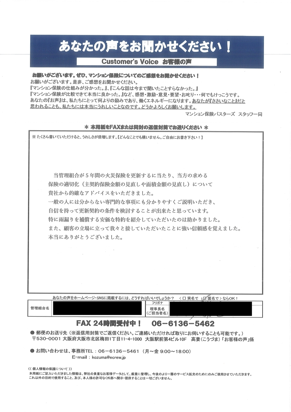 M様、ありがたいお言葉をいただきありがとうございます。こちらこそ、必要な資料や情報を的確にご提供いただき感謝いたします。フロントの方の対応も管理会社によってまちまちですが、M様は管理組合様の目線に立ち行動されているなと感心いたしました。こちらこそ今後ともどうぞよろしくお願いいたします。